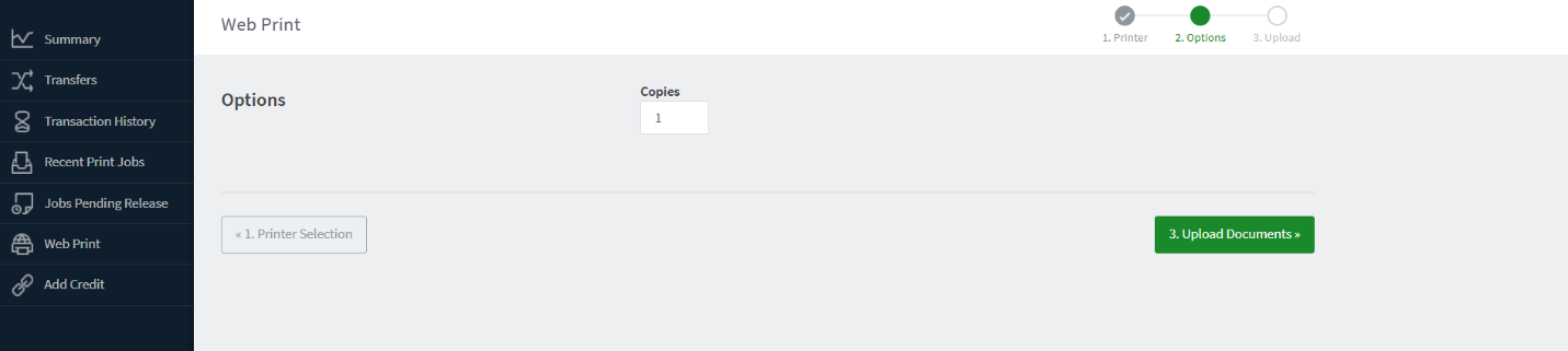 4. Confirm the print name / account selection, select number of copies, and click Upload Document.